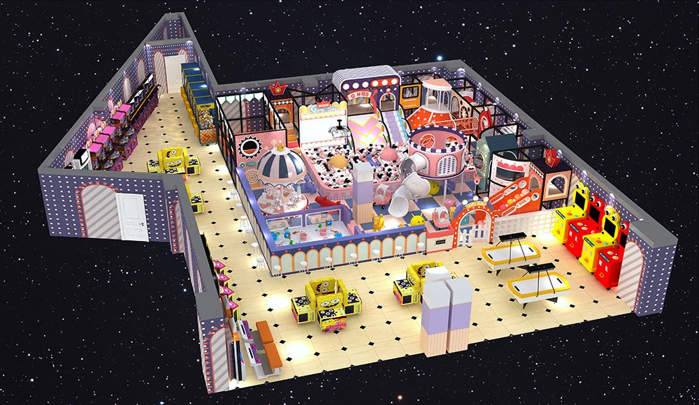 This playground equipment mainly includes climbing network,half volcano slide,interactive projection games,sand toys,combined slides,rectangle trampoline park,merry go round,big ball pool,styling watchtower with spiral tube slide etc.Outer of the playground there have some Coin machine,Doll machine,Arcade games.