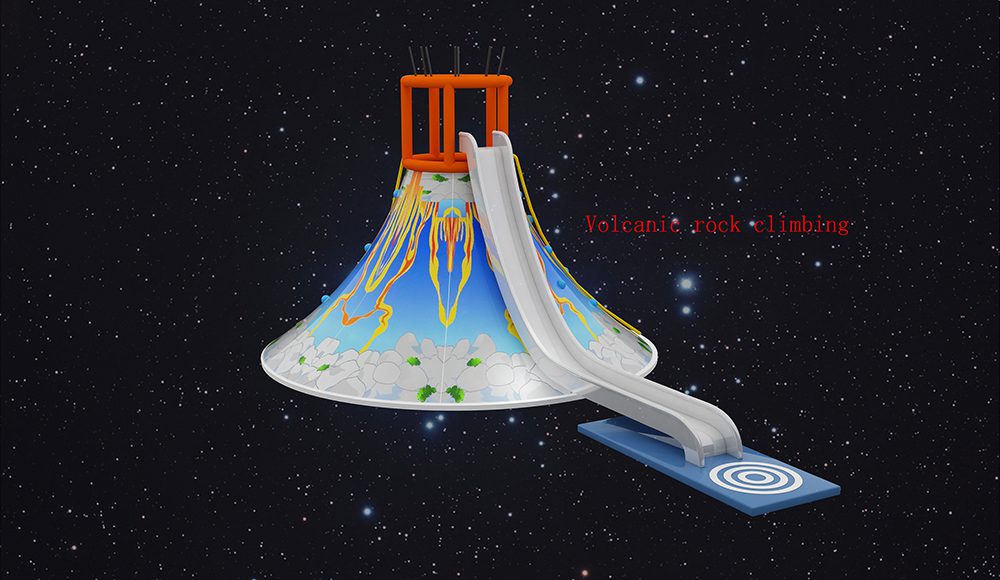 The slide itself is designed to resemble a volcano, with fiery reds and oranges painted onto its surface. Its sides are adorned with faux rocks, giving it an authentic volcanic feel. As children climb to the top, they feel the excitement building, as if they’re embarking on an adventure to the top of a real volcano.At the bottom of the slide, children emerge with smiles on their faces, exhilarated by the thrilling ride they’ve just experienced. They eagerly run around to climb back up and ride again, enjoying the adventure of the playground volcano slide with more enjoy.